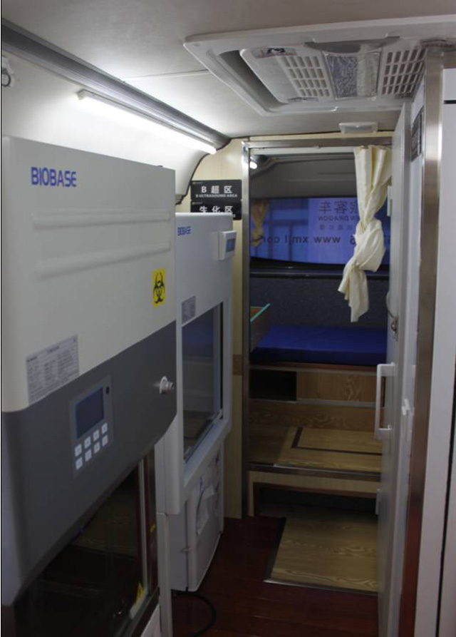 在正規(guī)的體檢醫(yī)療車上,同時配備有心電圖檢查儀、檢查床、冰柜、空調和紫外線消毒燈等一系列正常體檢和急救所需的所有設備。因為其流動性強,在下鄉(xiāng)醫(yī)療活動中起到了很關鍵的作用,對于某些經(jīng)濟不發(fā)達的地區(qū),醫(yī)療條件較差,相關衛(wèi)生部門可以組織免費體檢一類的活動,大大方便了那些沒有錢進行定期體檢的人。車上有B超檢測器、胸透等儀器,孕婦也能做些保險性的檢查。體檢醫(yī)療車分為幾種,分別為全科體檢車、婦女健康管理車和DR體檢車。比較而言,前者是一把抓,中間一個是分特定對象的,而最后的是搭配有DR設備的體檢車。