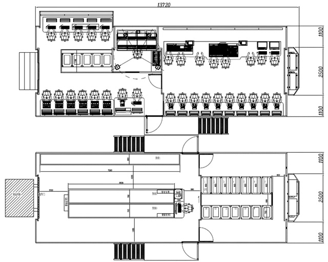 由于收車(chē)時(shí)內(nèi)套拉箱頂收回,強(qiáng)冷機(jī)柜若在拉箱區(qū),出回風(fēng)會(huì)很難設(shè)計(jì),所以通常將強(qiáng)冷柜放在不帶拉箱的部位,加上兩側(cè)拉箱總寬度不得超2.5米,這導(dǎo)致整個(gè)廂體很難做大,以下是幾種最常見(jiàn)的布局,基本都是配備4組強(qiáng)冷機(jī)柜,如果想要增加強(qiáng)冷機(jī)柜數(shù)量,就需要減小拉箱面積,這就會(huì)影響到制作區(qū)和技術(shù)區(qū)面積。無(wú)論是單外套還是雙外套,由于拉箱頂在主頂外邊,強(qiáng)冷的出回風(fēng)就比較好設(shè)計(jì),但同樣受到兩側(cè)拉箱總寬度不得超2.5米的限制,廂體也不可能做太大,可以考慮配合第三級(jí)內(nèi)套拉箱使用由于內(nèi)外套是采用上下疊加的形式,避開(kāi)了左右相加不能超2.55米的限制,所以設(shè)計(jì)起來(lái)就比較靈活,也能做得更大,強(qiáng)冷區(qū)只要避開(kāi)內(nèi)套拉箱,出回風(fēng)也比較好設(shè)計(jì)。以下是最近國(guó)內(nèi)比較常見(jiàn)的布局。