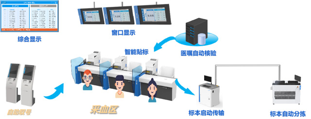 采血流程:患者到窗口采血-掃碼或讀就診卡-核對(duì)檢驗(yàn)項(xiàng)目-打印標(biāo)簽-選擇試管-粘貼試管-護(hù)士采血。人工采血存在問題人工選管、打印、粘貼,勞動(dòng)強(qiáng)度大。容易出現(xiàn)人為錯(cuò)誤。貼歪、貼倒(不能識(shí)別)。位置錯(cuò)誤(流水線無法識(shí)別)。視窗覆蓋(無法觀察血液情況)??赡艹霈F(xiàn)漏采或多采血。智能采血設(shè)備解決采血人的排隊(duì)難題,智能采血管理系統(tǒng)把采血管的準(zhǔn)備工作自動(dòng)化,縮短等待時(shí)間。采血流程需要全面的優(yōu)化,報(bào)到取號(hào),65歲以上老人優(yōu)先。智能叫號(hào)不需要長時(shí)間的排隊(duì)。采血管容量大,處理速度快,能有效加快采血速度,提高采血服務(wù)質(zhì)量。自動(dòng)化代替了傳統(tǒng)人工的操作模式。自動(dòng)識(shí)別自動(dòng)貼標(biāo),自動(dòng)標(biāo)本核收。大大的減少人工誤差。也減少繁雜的采血前準(zhǔn)備,系統(tǒng)具有諸多優(yōu)勢,將為客戶帶來全新的體檢體驗(yàn)。
