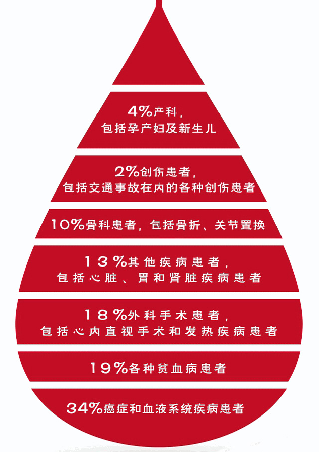 也就是大家獻的血經(jīng)過分離檢驗存儲后送到各大醫(yī)療機構(gòu)用來對有需要輸血的病人輸血救治。其實我們很多人有個認識誤區(qū),以為血液就是在災(zāi)難時候才需要獻血,其實醫(yī)院每天有不少病人需要各種血液成分來搶救治療。大量失血的病人,外傷大出血,大型手術(shù)跟其他原因低血量,輸血來補充血液,血液大部分用于癌癥跟血液疾病的病人。慢性失血、紅細胞被破壞或白蛋白合成不足。如血友病、血小板減少癥或血小板功能障礙。凝血異常導(dǎo)致失血,具體來講血液有個使用比例數(shù)據(jù)。有助于挽救生命延長生命提高生活質(zhì)量。