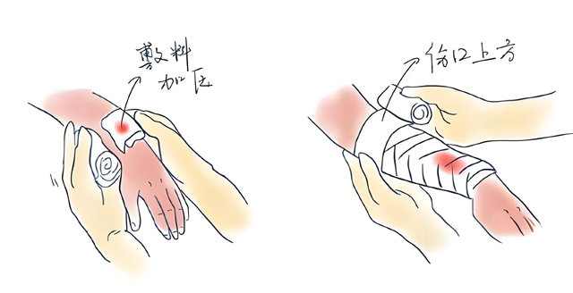 (1)按壓止血,將消毒過的棉布?jí)|在傷口上,按壓10分鐘左右。