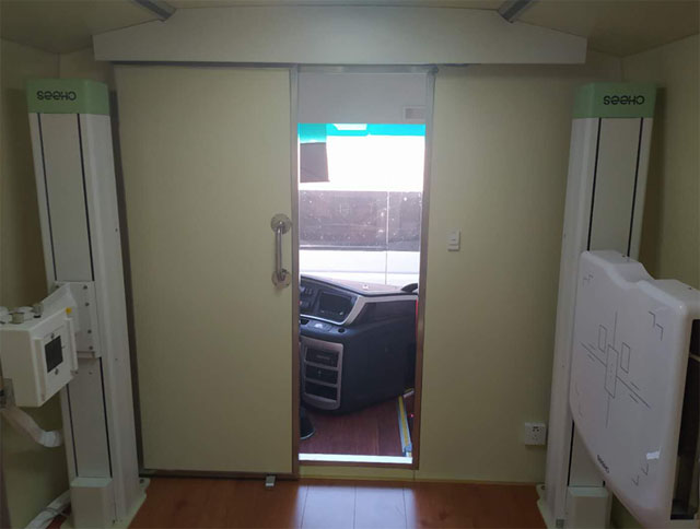 車內(nèi)安裝有操作工作臺,配套主機柜1個、推拉抽屜(用于放置鍵盤)1個、小圓凳1個,工作臺與X線檢查室之間的隔斷上鑲嵌了1塊400×600×25mm鉛玻璃。